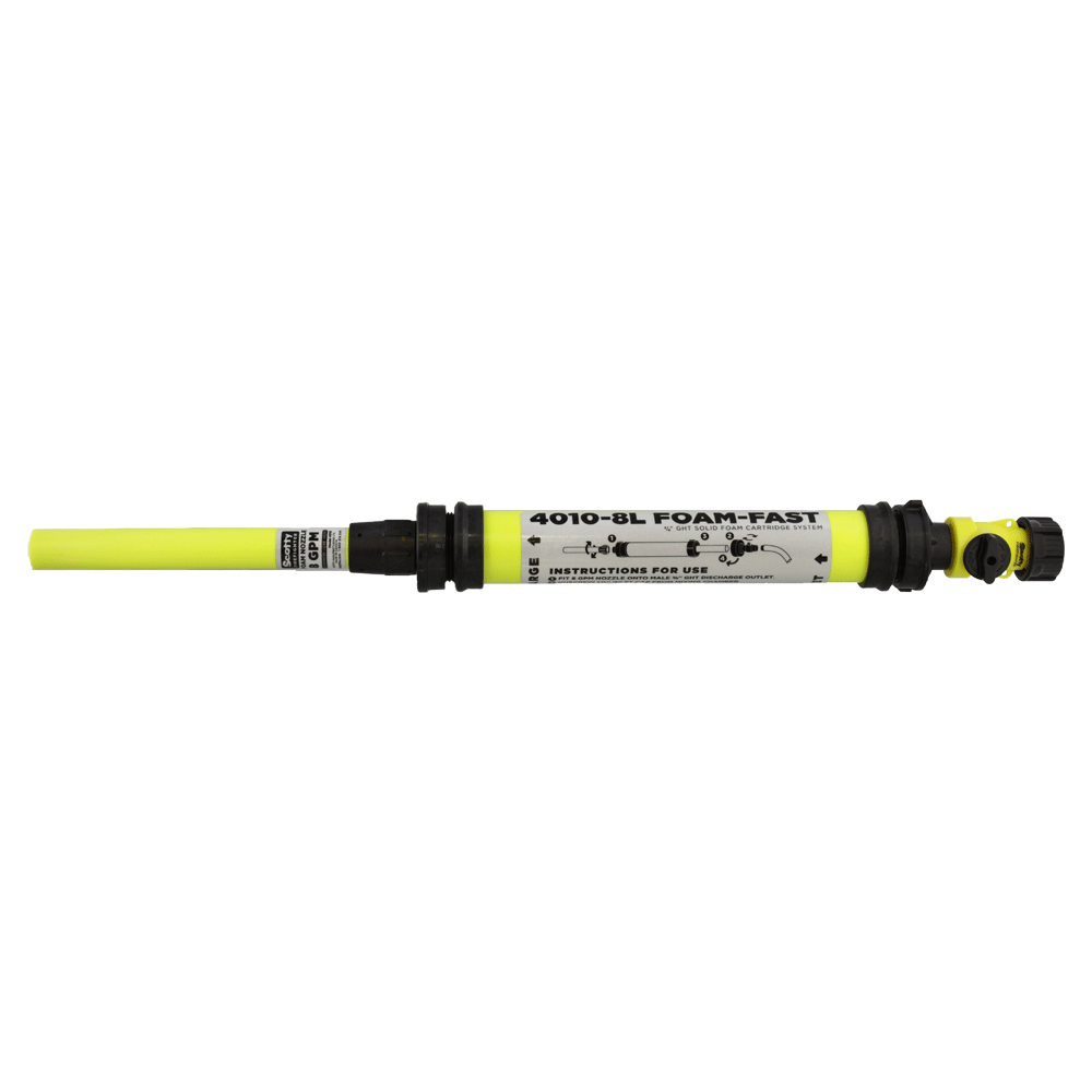 - To operate, open the inlet side of the mixing chamber, insert a Foam-Fast™ cartridge, reseal the inlet end cap, attach to a supply hose and spray Class A foam.